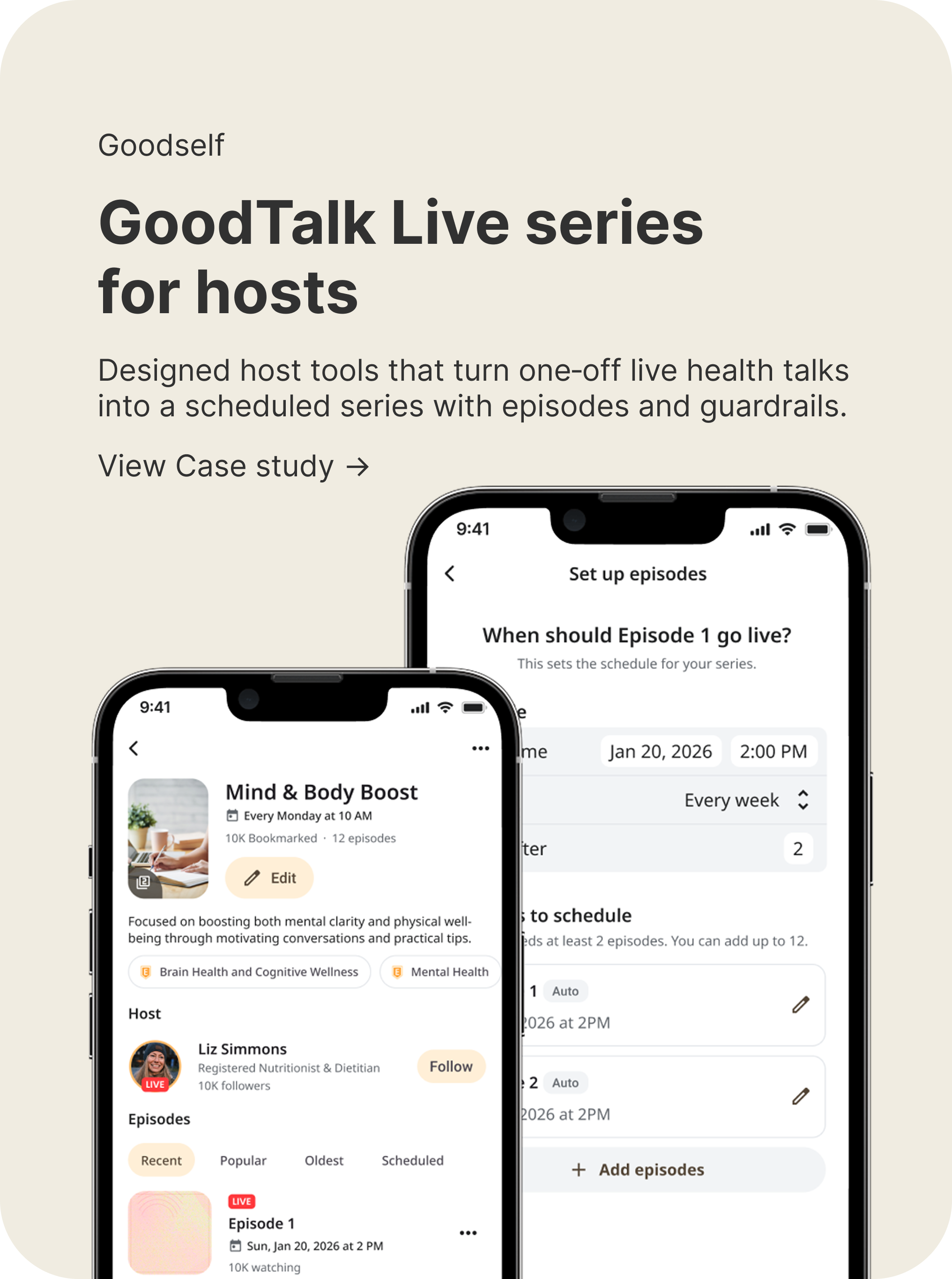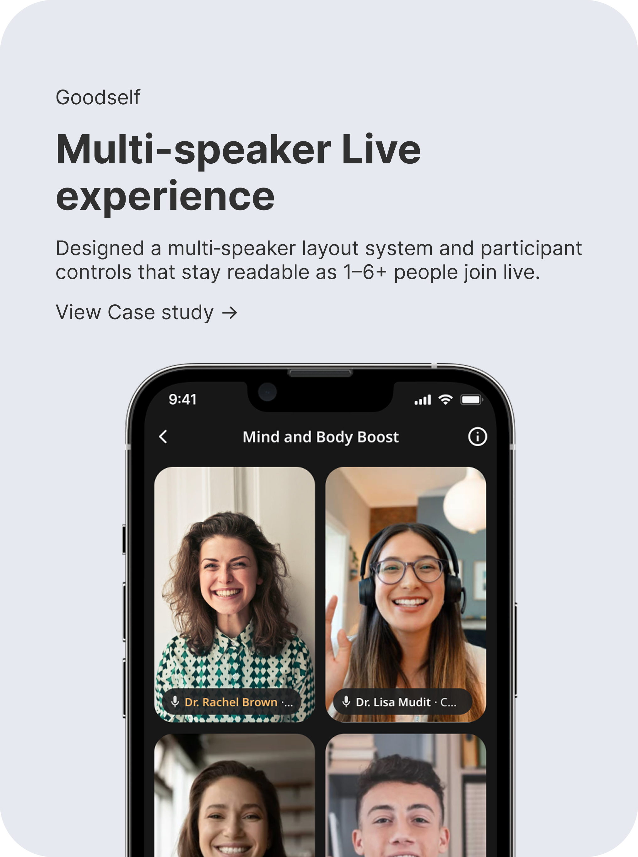 Most recently, I shipped GoodTalk Series (creation + scheduling) and a multi‑speaker live session layout system at Goodself. Outside of work, I stream on Twitch and pay close attention to chat, pacing, and “in-the-moment” UX.