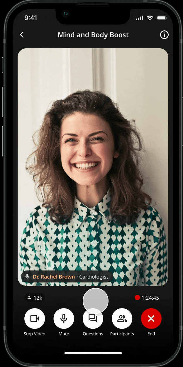 On mobile, live sessions compete with chrome (controls, labels, navigation). I introduced a tap-to-hide UI behavior so viewers can temporarily remove controls and give the speaker more space then bring controls back instantly when needed.